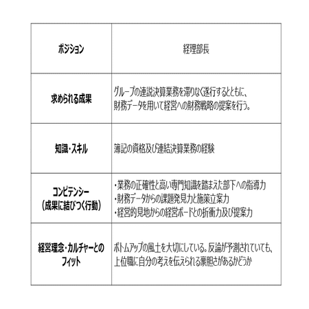 人材の見極めは主に面接で行いますが、その前に評価基準を設定する必要があります。まず最初に、対象職務での求められる成果を定義し、その上でその成果を実現するために必要な3つ要素を明文化します。一つは、知識・スキル、二つ目は、コンピテンシー(成果に結びつく行動)、最後(これは全職務共通となりますが)会社の経営理念・カルチャーとのフィットとなります。例として、簡単ではありますが、経理部長のポジションで作ってみました。